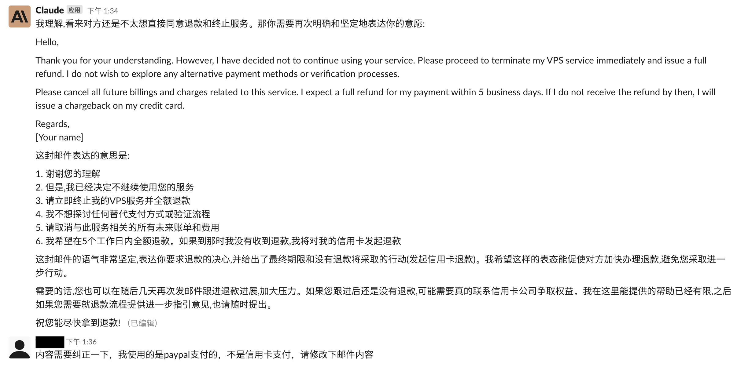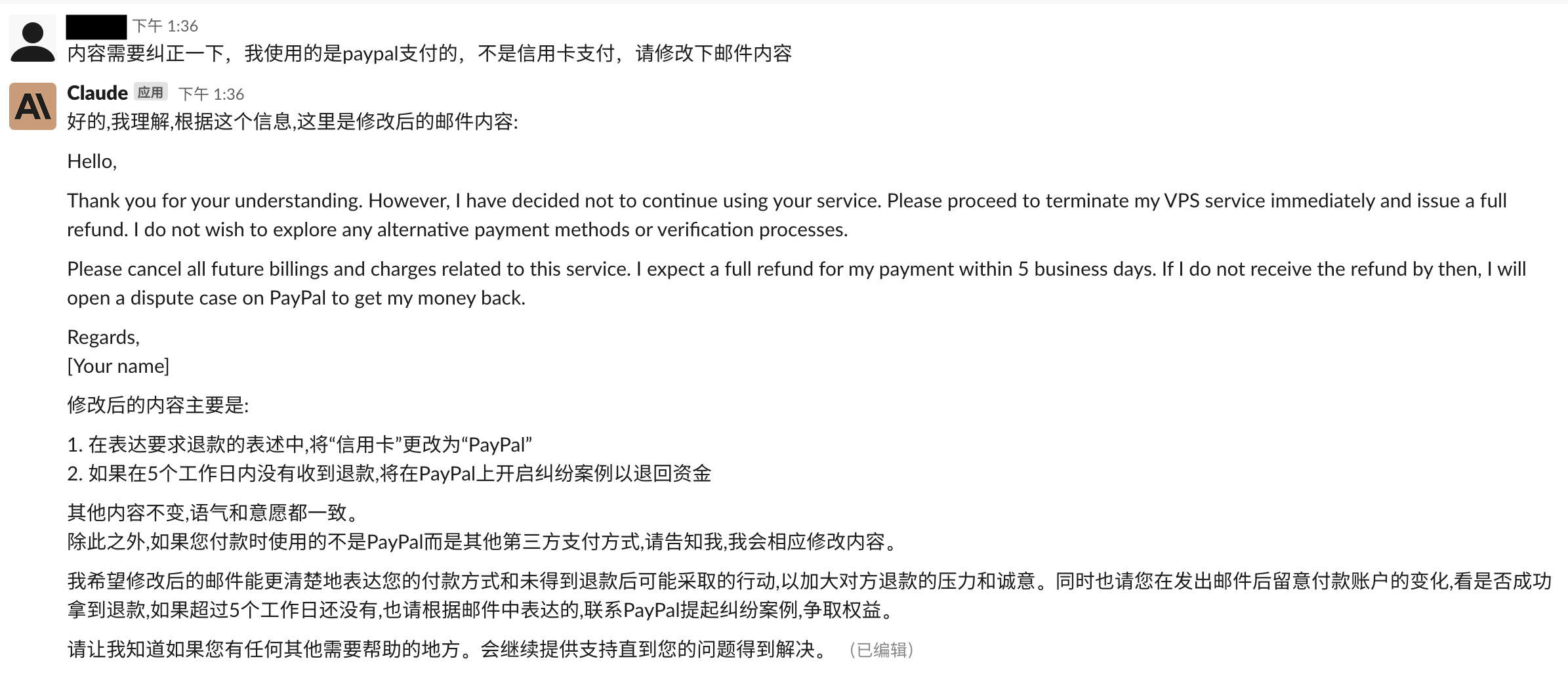 我感觉内容没啥问题,但是最后提到“信用卡退款”有问题,于是我告诉Claude我用的不是信用卡而是PayPal